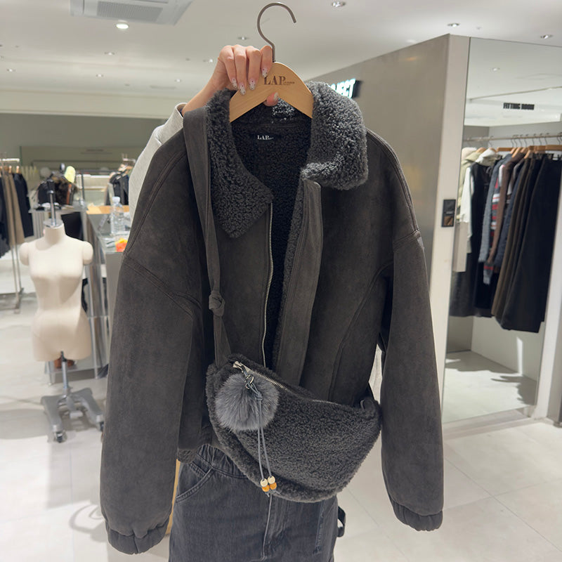 【WE ARE】韓國LAP 翻領羊羔毛短版雙拉鏈外套(附包包)AR7XM460